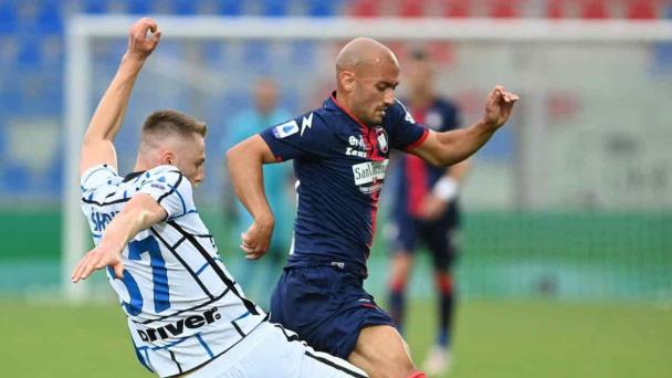 Milan Skriniar, del Inter, izquierda, y Ahmad Benali de Crotone, disputan un balón en el partido entre Crotone e Inter Milan.