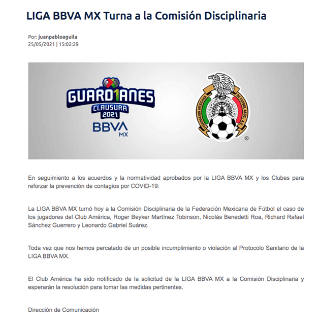 "Toda vez que nos hemos percatado de un posible incumplimiento o violación al protocolo sanitario de la Liga BBVA MX.
