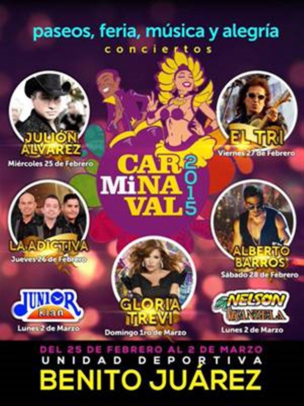 Los conciertos de este carnaval se realizarán en la Unidad Deportiva Benito Juárez, iniciando el 25 de febrero con la presentación de Julión Álvarez, el 26 La Adictiva , el 27 encenderá emociones El Tri, el 28 pondrá el sabor salsero Alberto Barros y el 1 de marzo estará Gloria Trevi.