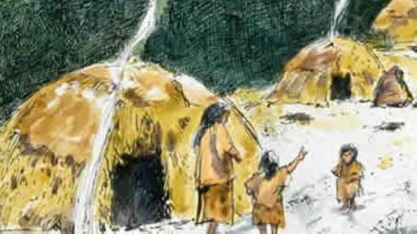 Representación de la estructura de las casas de campana o bóveda, incluyendo el fogón, utilizadas principalmente por los grupos étnicos de Nuevo León y de algunos lugares de Texas.