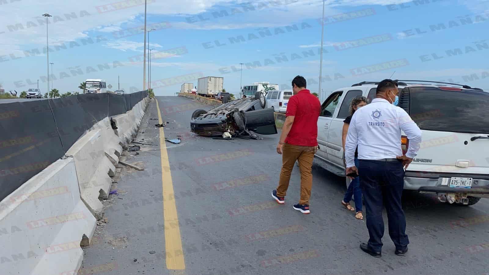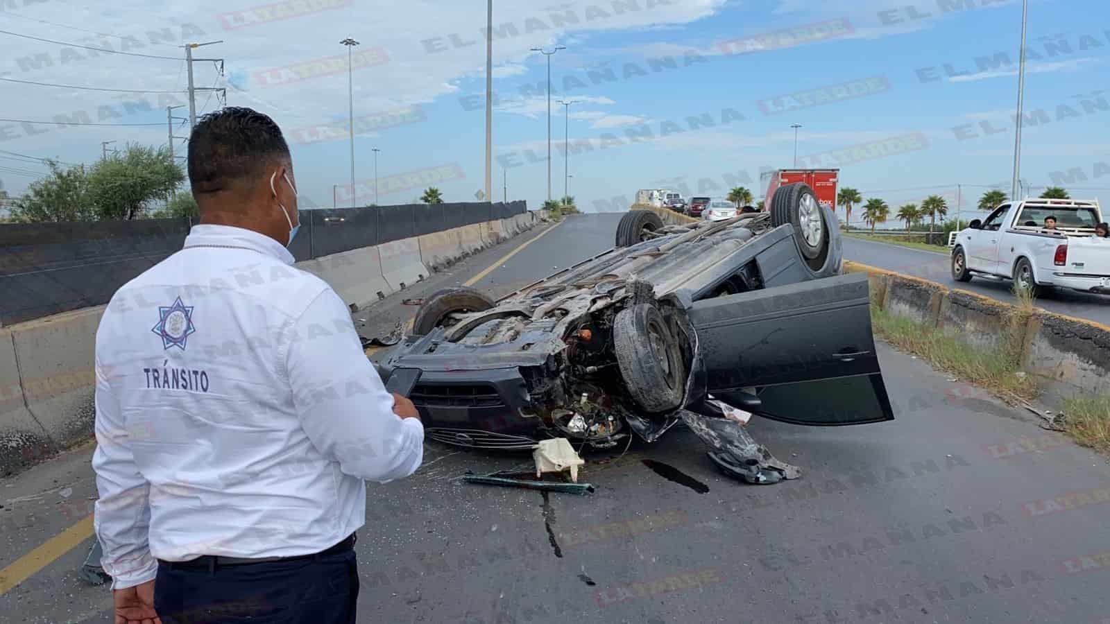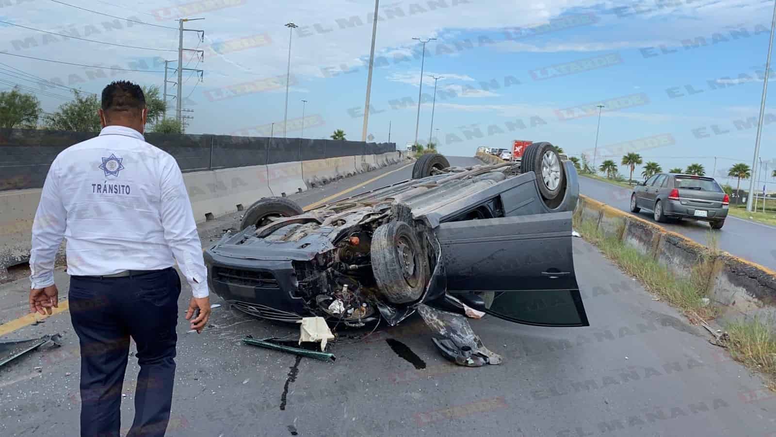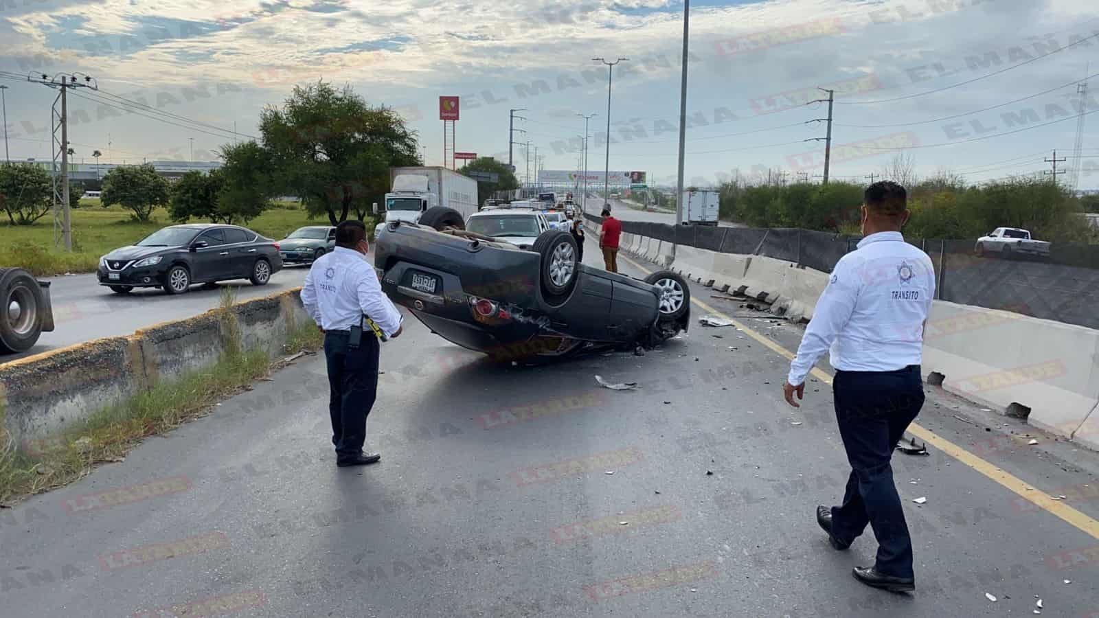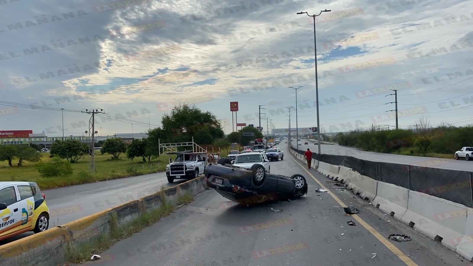 Luego de que un camión le cerrara el paso y chocara, un joven conductor perdió el control de su unidad y terminó volcando en el libramiento a Monterrey.
