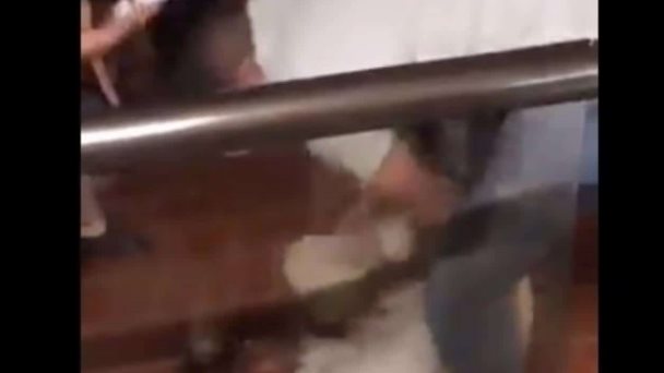 En las imágenes se percibe cómo un sujeto vestido con una playera blanca, pantalón de mezclilla y calzado negro golpea a un hombre de pantalón caqui, todo frente a un policía.