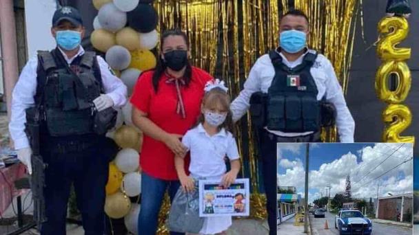 Matamoros, Tam. - Una pequeña del Jardín de Niños “Club de Leones Matamoros Sur” de la colonia México Agrario, llegó a su graduación mediante del Drive Thru a bordo de una patrulla de la Policía Estatal marcada con el número 967 lo que causó sorpresa entre sus maestros.
