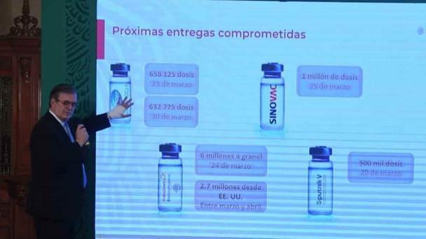 El 18 de marzo se informó que el presidente estadounidense, Joe Biden, enviaría a México dosis excedentes de vacunas contra el coronavirus. Entonces el canciller Ebrard precisó que llegarán 2.5 millones de dosis de la vacuna de AstraZeneca al país, procedentes de EU. "El acuerdo con EU da prioridad a AstraZeneca para asegurar la segunda dosis de 870 mil adultos mayores a quienes se les aplicó en febrero. Se trata de 2.5 millones de dosis. Sería el mejor inicio de una amplia cooperación en vacunas. Seguimos trabajando, concluiremos en la noche", escribió en su cuenta de Twitter.