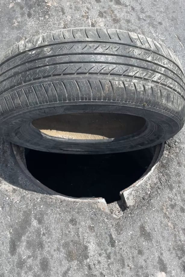 El afectado colocó una llanta en el agujero para alertar a otros conductores del peligro y explicó lo ocurrido.