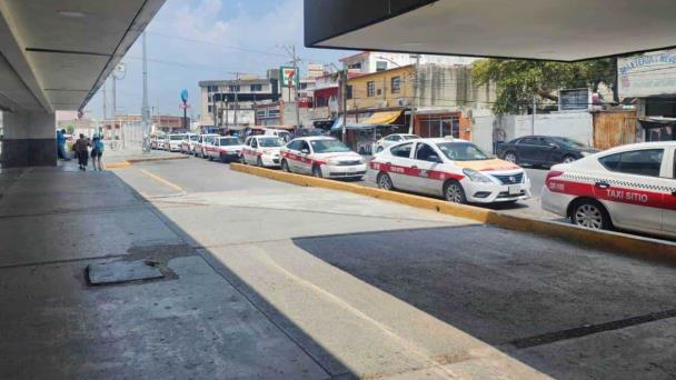 Taxis en espera de pasajeros en las inmediaciones de la central, reflejando la intensa competencia entre conductores que enfrentan un mercado saturado.
