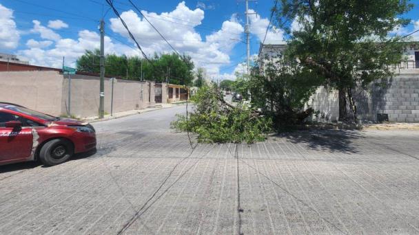 Una rama de grandes dimensiones se desplomó sobre los cables de alta tensión en la calle Rodolfo Garza Cantú, casi esquina con Loreto, en la colonia Longoria. El interior del tronco estaba podrido, y al quebrarse arrastró el tendido eléctrico, bloqueando por completo la vialidad.