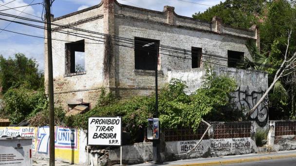 En la calle Juárez, muy cerca de la Plaza Juárez, se encuentra otra vivienda abandona y vandalizada que contrasta con la actividad comercial de la zona.