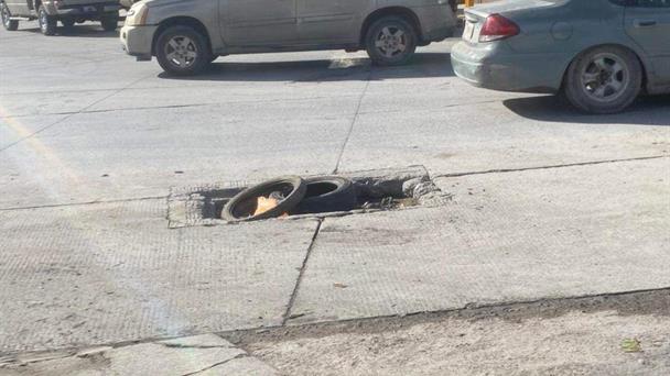 Ante la falta de atención por parte de las autoridades, los vecinos optaron por colocar un par de neumáticos alrededor del agujero, con la intención de evitar accidentes en la zona.