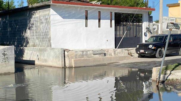 Una fuerte fuga de aguas negras mantiene inundada la calle 12 de octubre en la colonia Lucio Blanco.
