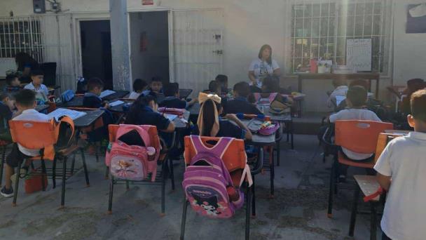 Unas 300 niñas y niños de dos primarias reciben clases al aire libre debido a una falla eléctrica que dejó sin luz los planteles.