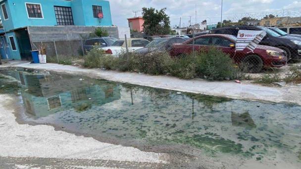 Residentes del fraccionamiento Río Grande reportan la presencia de severos encharcamientos a causa de una gran fuga de aguas negras.