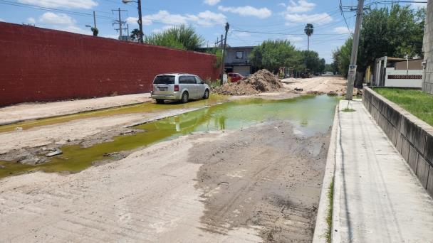 Una fuga proveniente de la pared de un domicilio ubicado a cuatro cuadras recorre las canaletas hasta llegar a la calle Río Bravo, donde mantiene encharcada la vialidad a un costado de la Secundaria Técnica #60. El agua verdosa ya cubre banquetas y accesos vehiculares, sin embargo, los vecinos mencionan que podría tratarse de agua potable pues no emite un olor fétido aun con el sol.