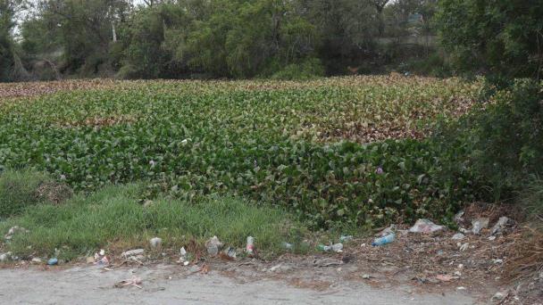 La superficie de este cuerpo de agua se encuentra casi completamente cubierta por lirio acuático, poniendo en riesgo a tortugas, peces y ranas