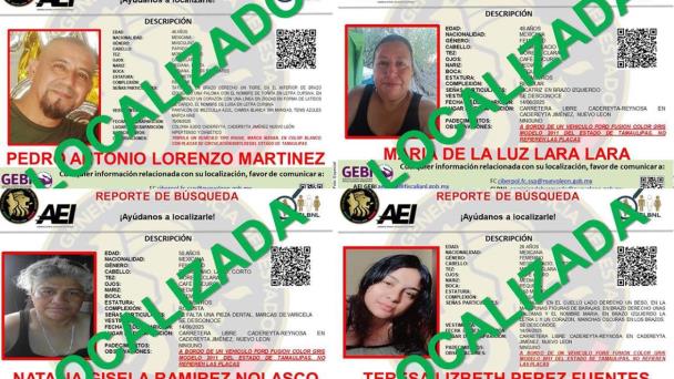 Las personas identificadas como María de la Luz Lara Lara, Natalia Gisela Ramírez Nolasco, Teresa Lizbeth Pérez Fuentes y Pedro Antonio Lorenzo Martínez habían sido reportadas como desaparecidas luego de su trayecto por la carretera Monterrey-Reynosa.