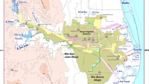 Extensión de los sistemas de riego dentro del delta del río Bravo, que abarcan ambos lados de la frontera.