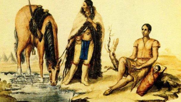 Acuarela de una familia de indios Comanches, 1828, según el artista Lino Sánchez y Tapia.