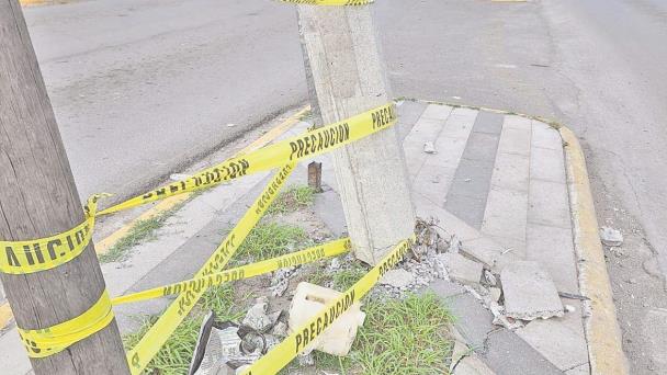 Sobre el camellón se observan los mismos daños que fueron denunciados anteriormente: concreto suelto, baldosas fracturadas y oxidación en la estructura. La inclinación del poste expone a conductores y peatones al riesgo de un posible colapso, especialmente porque en ese mismo punto se ubica un semáforo que regula el flujo vehicular.
