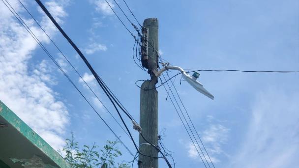 Un poste de madera con luminaria y cableado eléctrico, visiblemente dañado y con fractura y quemadura en la parte alta, se mantiene en pie desde hace casi dos meses sin recibir atención, pese a múltiples reportes realizados por vecinos del sector. Según testimonios, en días de viento fuerte llega a moverse ligeramente.