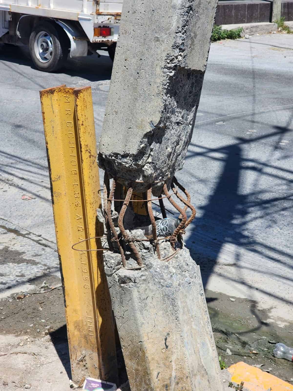 El poste con mayor daño permanece partido por la mitad, sostenido apenas por varillas y cables eléctricos.