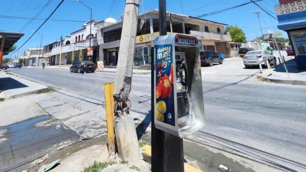 Las estructuras se ubican en la calle Enrique Canseco, esquina con calle Diez, en la colonia Pedro J. Méndez. Uno de los postes presenta el daño más severo: se encuentra partido por la mitad, con las varillas metálicas expuestas y dobladas, situación que ha provocado una desviación visible. El segundo poste, ubicado a escasos metros, muestra afectaciones importantes en su base.