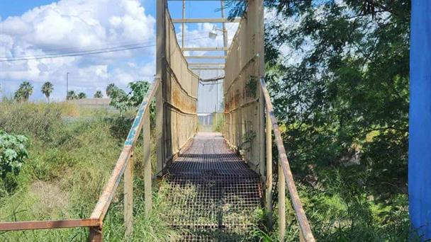 Un puente peatonal que conecta la colonia Campestre con el Parque Industrial del Norte se encuentra en condiciones de deterioro que generan preocupación entre los residentes de los domicilios aledaños a la casa hogar ¨Rio Bravo¨, quienes diariamente lo utilizan para trasladarse a sus trabajos en las maquiladoras cercanas.