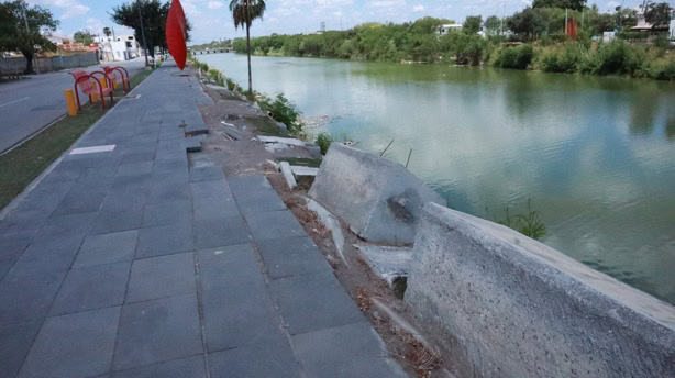 La orilla del canal Anzaldúas presenta un avance preocupante en su deterioro, situación que compromete la salud e integridad de los ciudadanos que transitan por la zona. Esta problemática se visualiza específicamente frente a la colonia Ayuntamiento, entre la calle Occidental y el libramiento Luis Echeverría, donde la falta de malla ciclónica a lo largo de largos tramos del canal representa un riesgo constante. En varios puntos, la malla cede hacia el interior del canal o descansa sobre la acera, mientras que en algunos lugares solo quedan los postes que la sostenían.