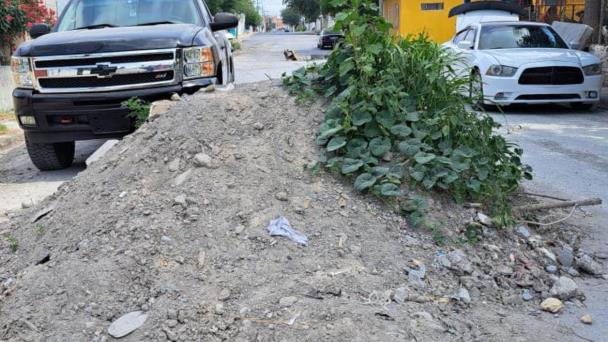 Montículos de tierra y yerbas bloquean calles en Reynosa