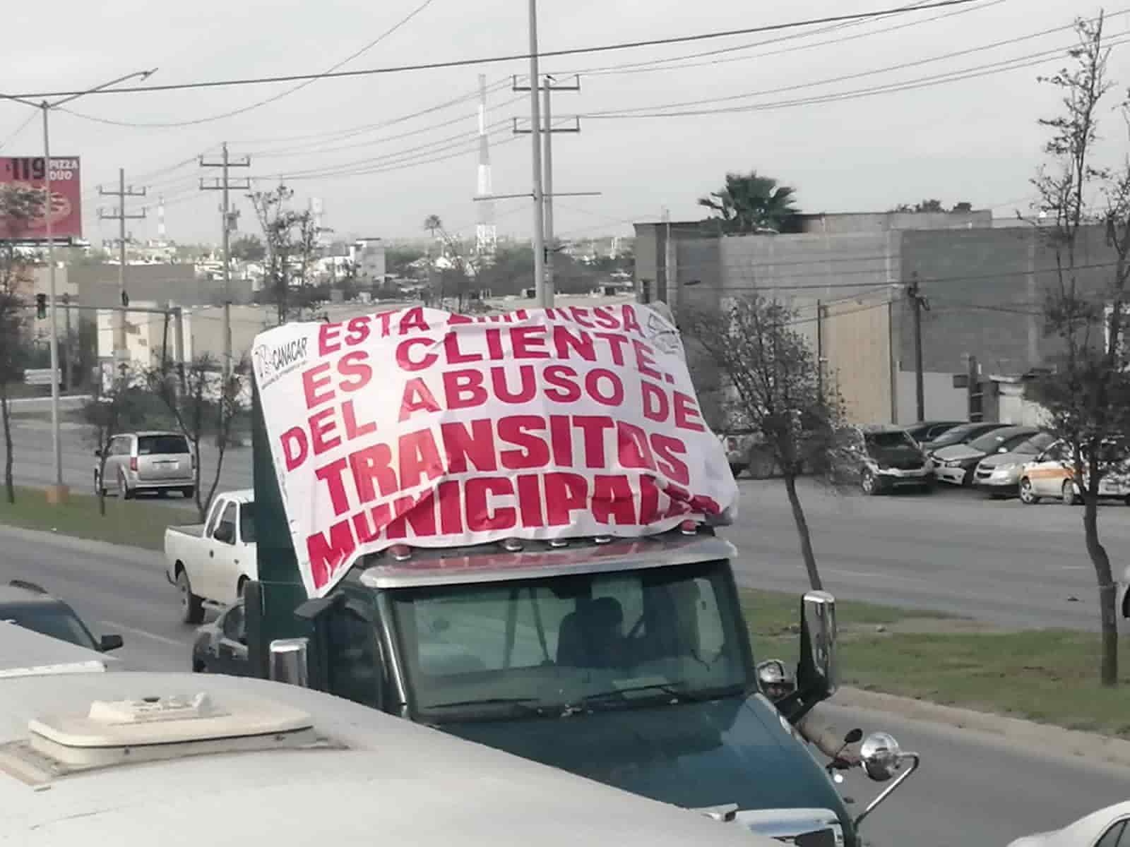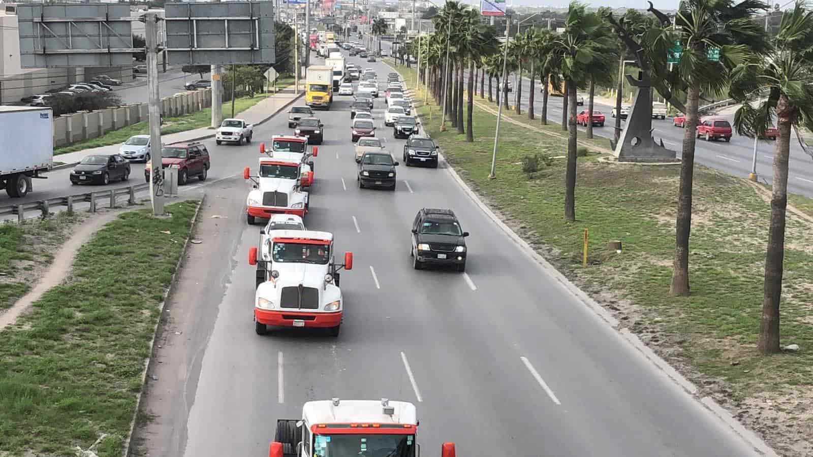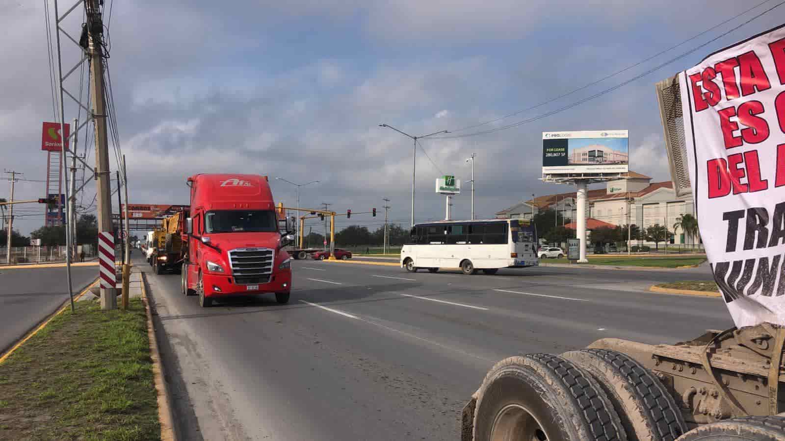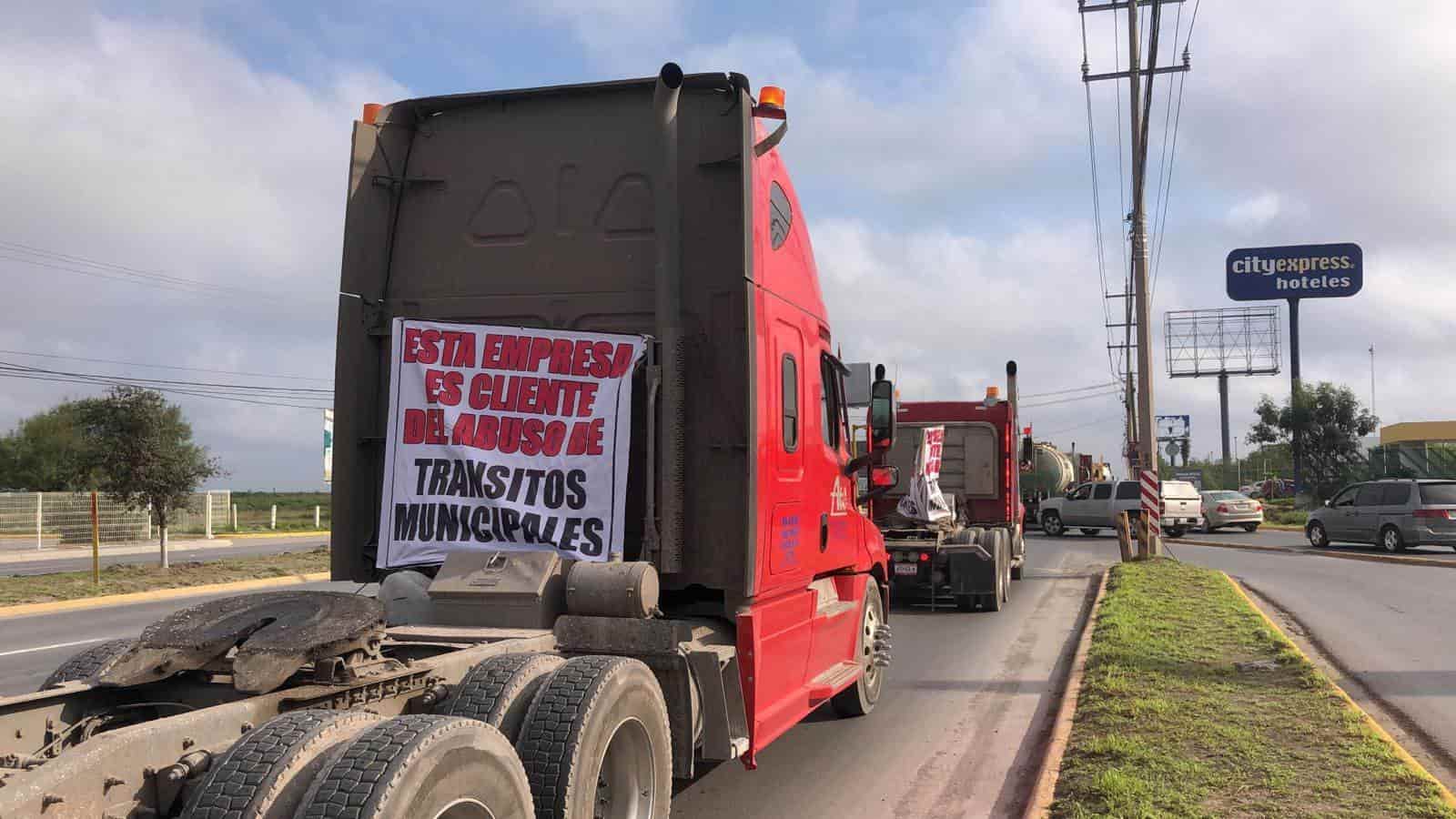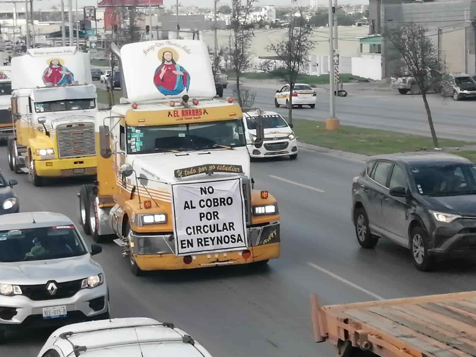 Alrededor de 300 camiones de carga comercial participan esta mañana en Reynosa, en una protesta móvil por las principales avenidas de la ciudad, en donde sus demandas son la destitución del Coordinador de Tránsito Municipal, Mario Soria Stamatio, y la oposición al cobro de un impuesto por circular en la ciudad.
