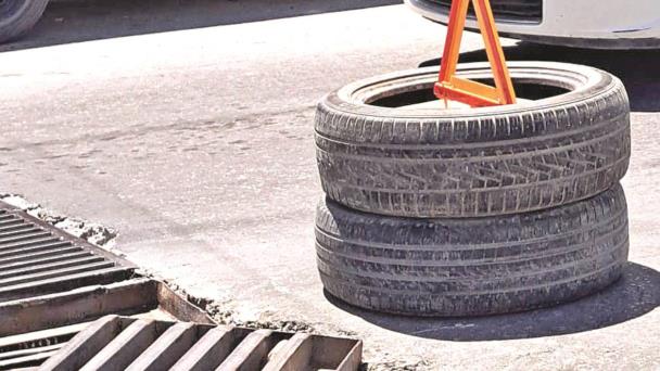 Para alertar sobre el riesgo que representan las rejillas metálicas desprendidas se colocaron dos neumáticos viejos y una señal luminosa, por lo que los conductores tienen que desviarse para evitar un accidente.