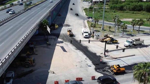 Obra vial en proceso bajo el puente del libramiento oriente que afecta la circulación y pone en riesgo a peatones en Reynosa.