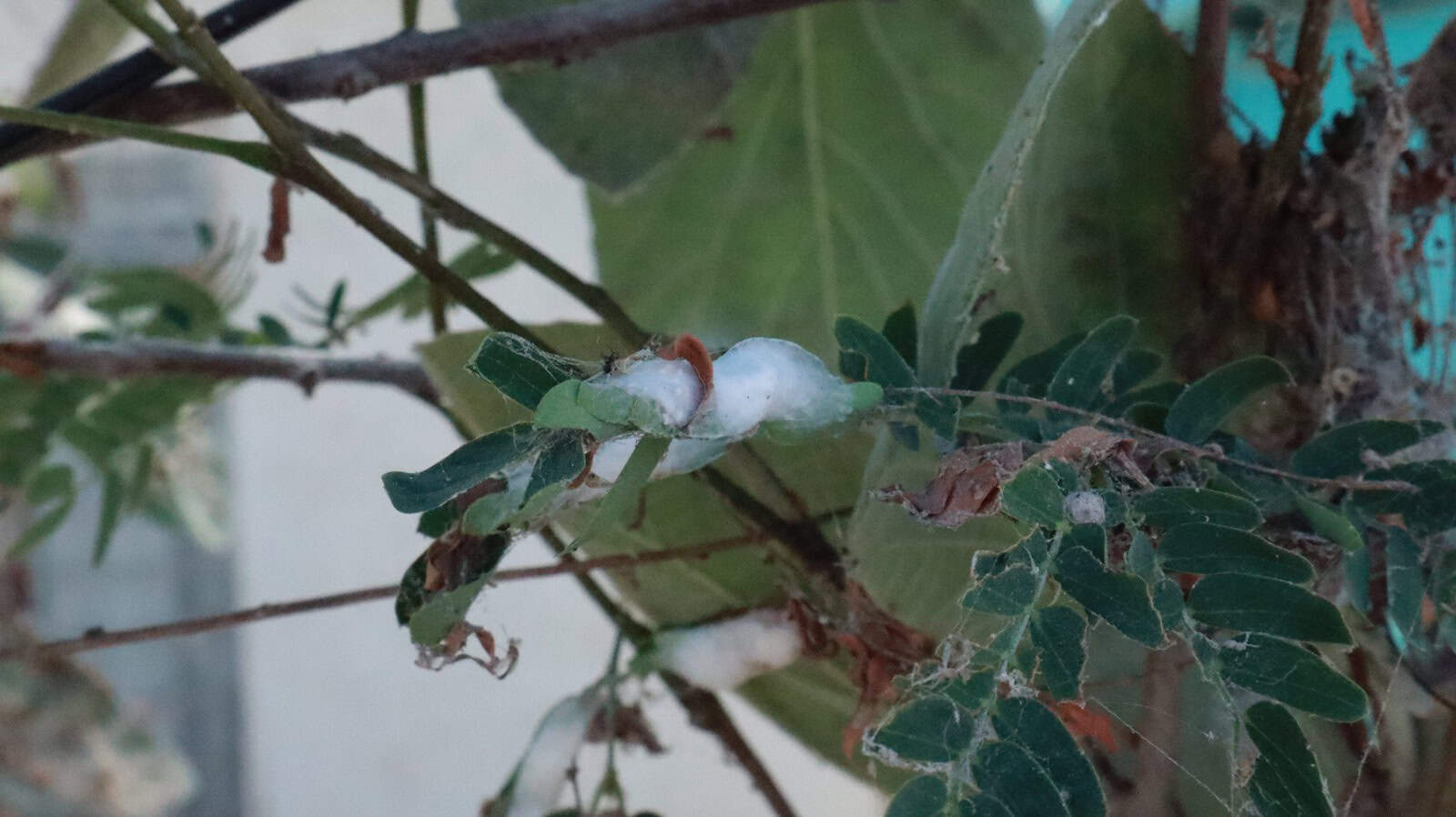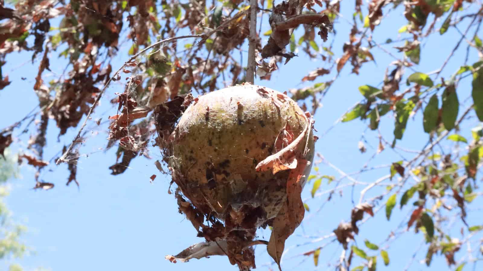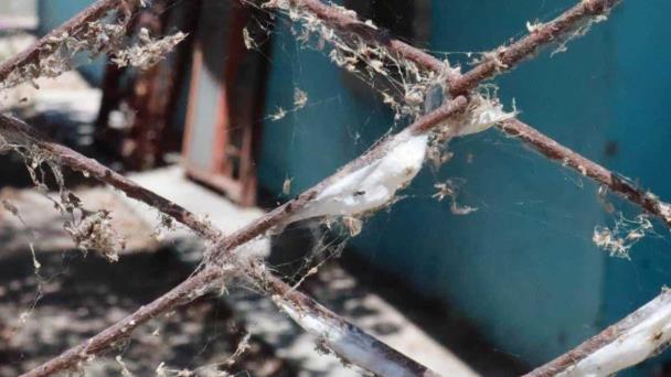Restos de telarañas aún visibles en árboles y cercas de la colonia Lázaro Cárdenas.