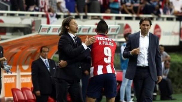 Matías Almeyda celebró con Alan Pulido uno de los goles del delantero ante Toluca. Foto: Ismael Ramírez