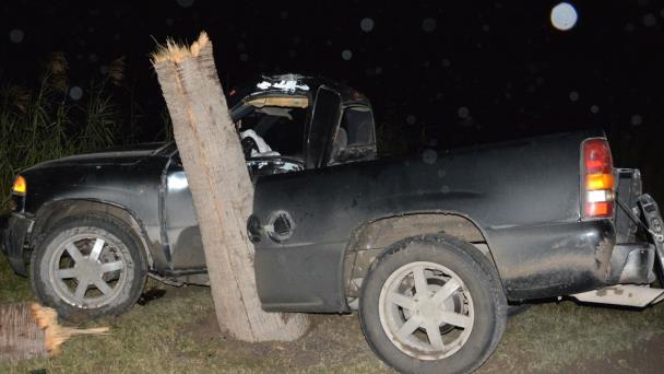 Presuntamente por el exceso de velocidad y el pavimento mojado, un conductor de 14 años de edad resultara lesionado al chocar la camioneta que conducía contra una palma.