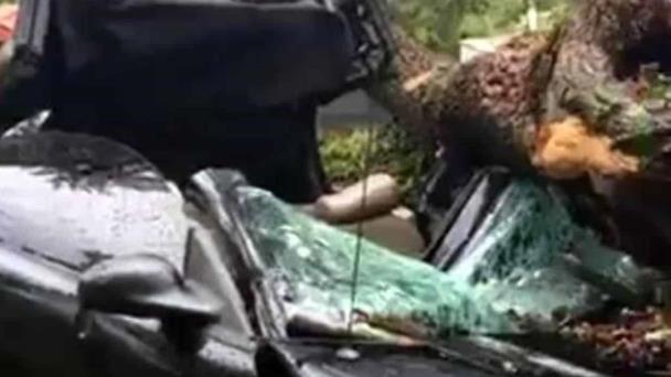 Un hombre que acababa de detener su auto Mustang resultó gravemente herido, luego de que un árbol de 10 metros de altura cayó sobre el vehículo y lo aplastó, en Montemorelos.