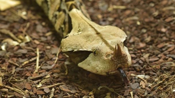 La víbora de Gabón es el miembro más grande del género Bitis y la víbora más pesada que existe: hasta dos metros de longitud y doce kilos de peso. Por suerte, a diferencia de otras parientes del género Bitis, es tímida y prefiere pasar desapercibida, mimetizándose con las hojas muertas del suelo, antes que atacar. No como su prima la víbora de ariete o bufadora (Bitis arietans), un mal bicho que resopla antes de lanzar su fulminante ataque y es responsable de más muertes que cualquier otra serpiente africana.