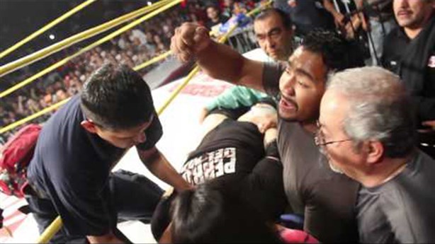 Las imágenes de video muestran a Aguayo inconsciente en las cuerdas tras recibir una patada voladora del luchador conocido como Rey Mysterio Jr., cuyo nombre de pila es Óscar Gutiérrez y quien tuvo una exitosa carrera de más de una década en la compañía estadounidense de lucha libre WWE.