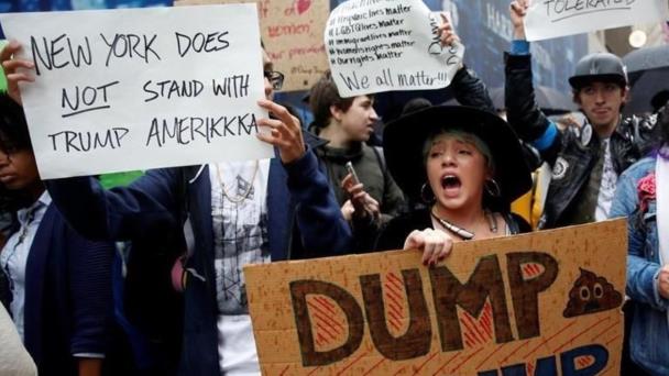 Luego que Donald Trump ganó la elección presidencial en EU, ciudadanos se manifestaron contra él en las inmediaciones de la Torre Trump. Foto: Reuters