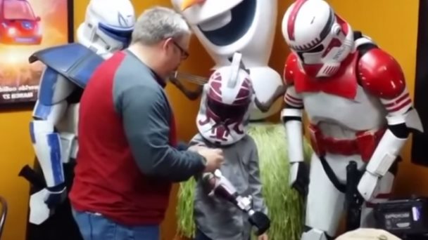 Una ONG construyó una prótesis de brazo para un niño de 7 años inspirada en los Clone Troopers de Star Wars y soldados galácticos acudieron a un cine local para entregarla.