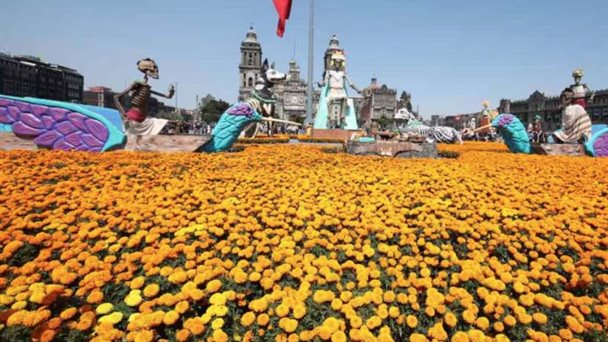 Mega Ofrenda del Zócalo luce tapete monumental de cempasúchil