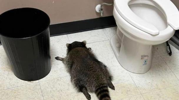 Mapache se emborracha en licorería y se queda dormido en el baño