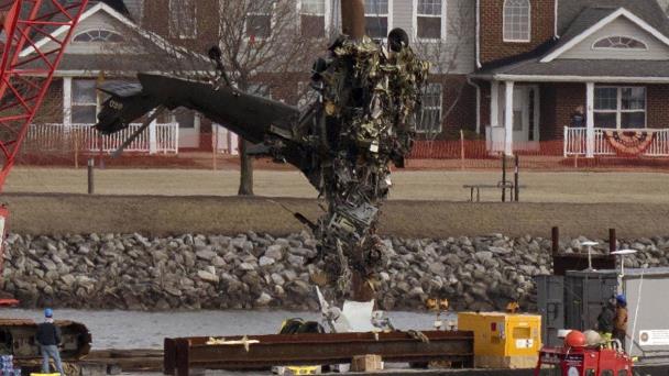 Cuerpos de rescate sacan restos de un helicóptero Black Hawk, luego del choque en Arlington, Virginia.