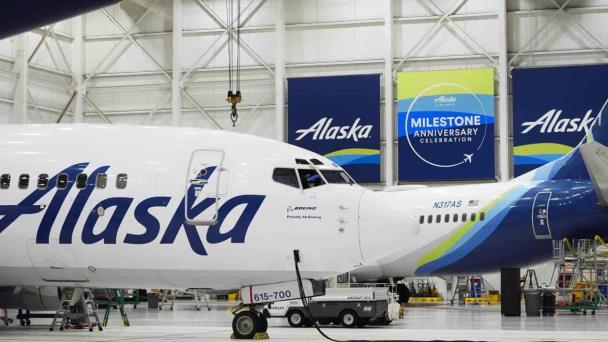 Un avión de Alaska Airlines se ve en el hangar de la compañía en el aeropuerto internacional de Seattle-Tacoma International, en SeaTac, Washington.