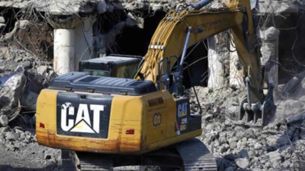Una máquina Caterpillar trabaja en la demolición de un edificio en el centro de Pittsburgh.