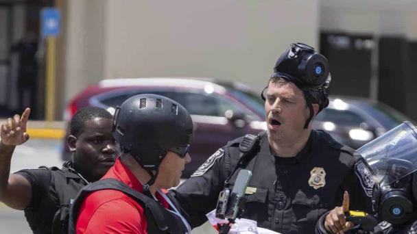 "Soy miembro de los medios, oficial", le dice Guevara a un policía momentos antes de ser arrestado. El video muestra a Guevara vistiendo una camisa roja brillante bajo un chaleco protector con la palabra "prensa" impresa en el pecho.