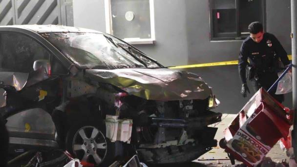 Un vehículo en la acera tras embestir a una multitud de personas que esperaban entrar a un club nocturno en un concurrido bulevar de Los Ángeles, dejó varios heridos, algunos de gravedad.