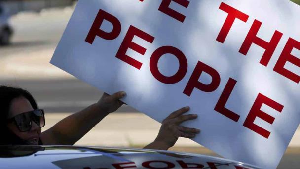 Una mujer sostiene un cartel en medio de una protesta contra el gobierno del presidente Donald Trump en Tucson.