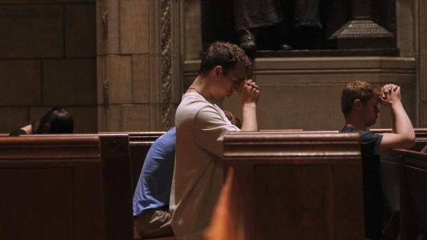 Eric Anderson, en el centro, ministro asociado del campus de la Universidad de Princeton, reza con otros después de una misa.