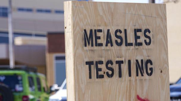 Un cartel que anuncia pruebas diagnósticas de sarampión afuera del Hospital de Seminole, en Texas.