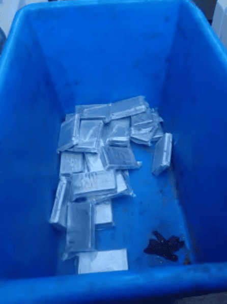 Aproximadamente diez minutos después, a las 3:11 p. m., los oficiales de la CBP encontraron un tercer tráiler vacío, conducido por un hombre de 52 años con una tarjeta de cruce fronterizo válida. El conductor y el tráiler fueron dirigidos a una inspección secundaria, donde una alerta canina provocó una búsqueda más exhaustiva. Los oficiales descubrieron un compartimento no perteneciente a la fábrica debajo del piso de la cabina que contenía 25 paquetes de cocaína, con un peso total de 63.44 libras.